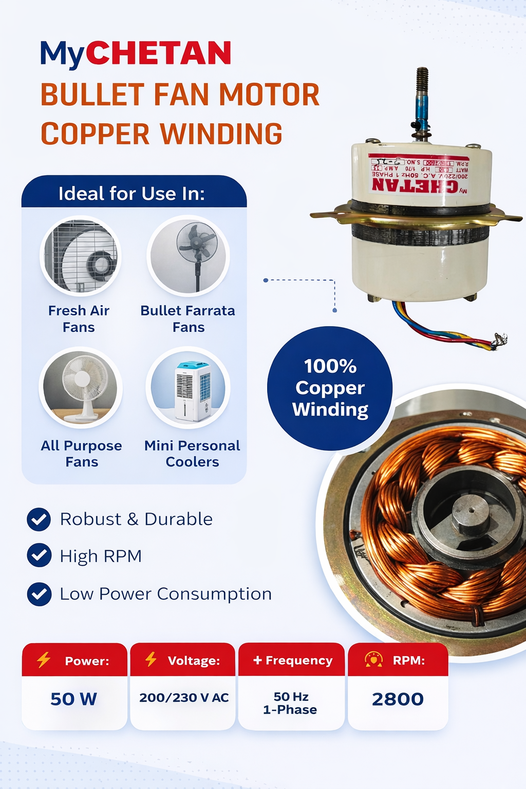 Upgrade your fan or cooler performance with the MyChetan High Speed Bullet Motor, designed for powerful airflow and long-lasting efficiency. Built with 100% pure copper winding, this motor delivers a smooth and stable 2800 RPM high-speed rotation, making it ideal for bullet fans, small personal air coolers, fresh air fans, and multi-purpose ventilation fans.
